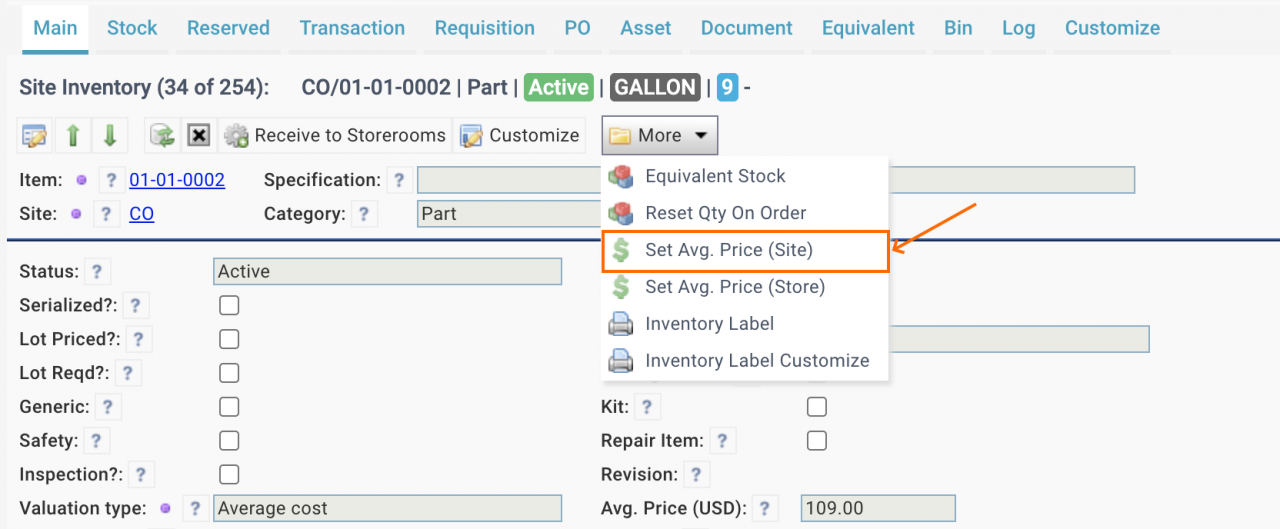 - Site Inventory has average unit price that is calculated based on inventory transactions as average moving cost. The average unit price is used in work order material cost calculation excepting asset, store-priced or lot-priced inventory items.