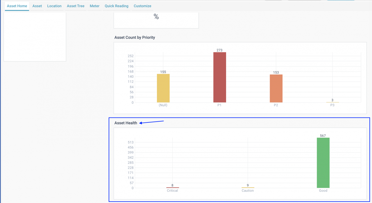 - Asset Home shows a bar chart of the current asset health in your Calem.